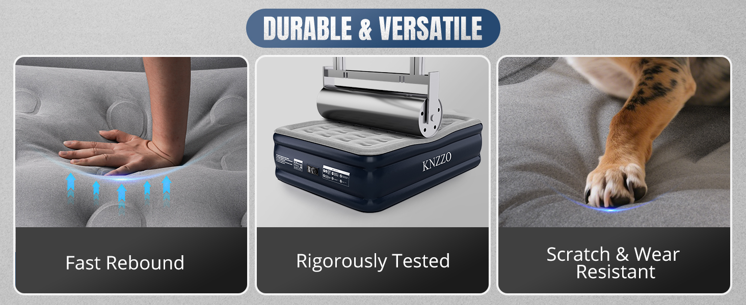 - Upgraded Material: This full air mattress features superior waterproof and anti-puncture performance. Made with high-strength, abrasion-resistant composite materials, it effectively resists scratches from sharp objects. The waterproof design ensures the mattress stays dry in any environment