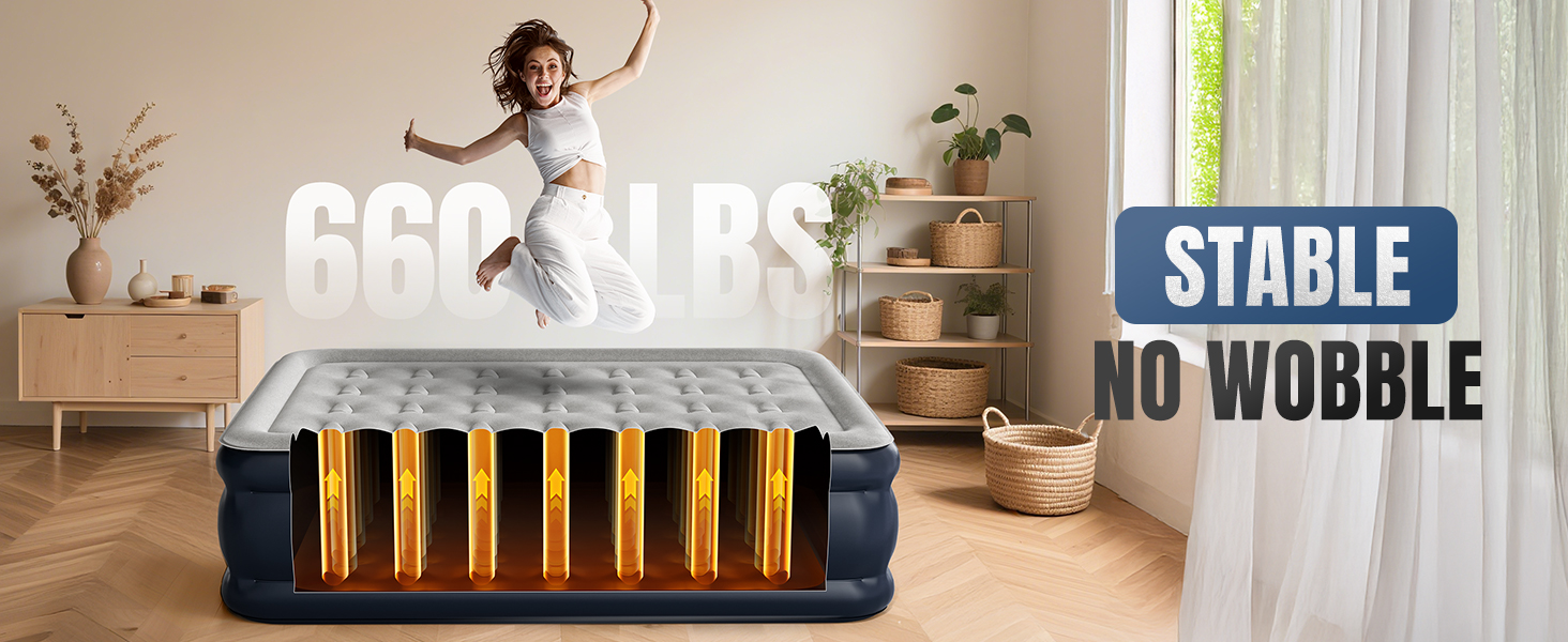 - Built-in High-Efficiency Pump – This inflatable air mattress features a powerful pump that inflates in just [3] minutes (exact time may vary). The easy-to-use control panel lets you adjust firmness instantly—no manual pumping or long waits. Deflates just as fast for compact storage."