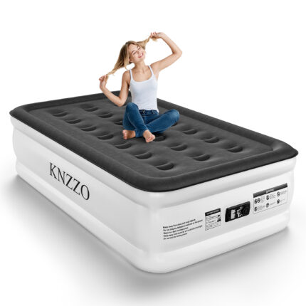 KNZZO Twin Air Mattress with Built-in Pump, 18″ Top Inflatable Mattress with Waterproof Flocking Fabric, Three-Minute Quick-Inflatable Bed. Portable Blow Up Mattress for Home, Outdoor and Guests