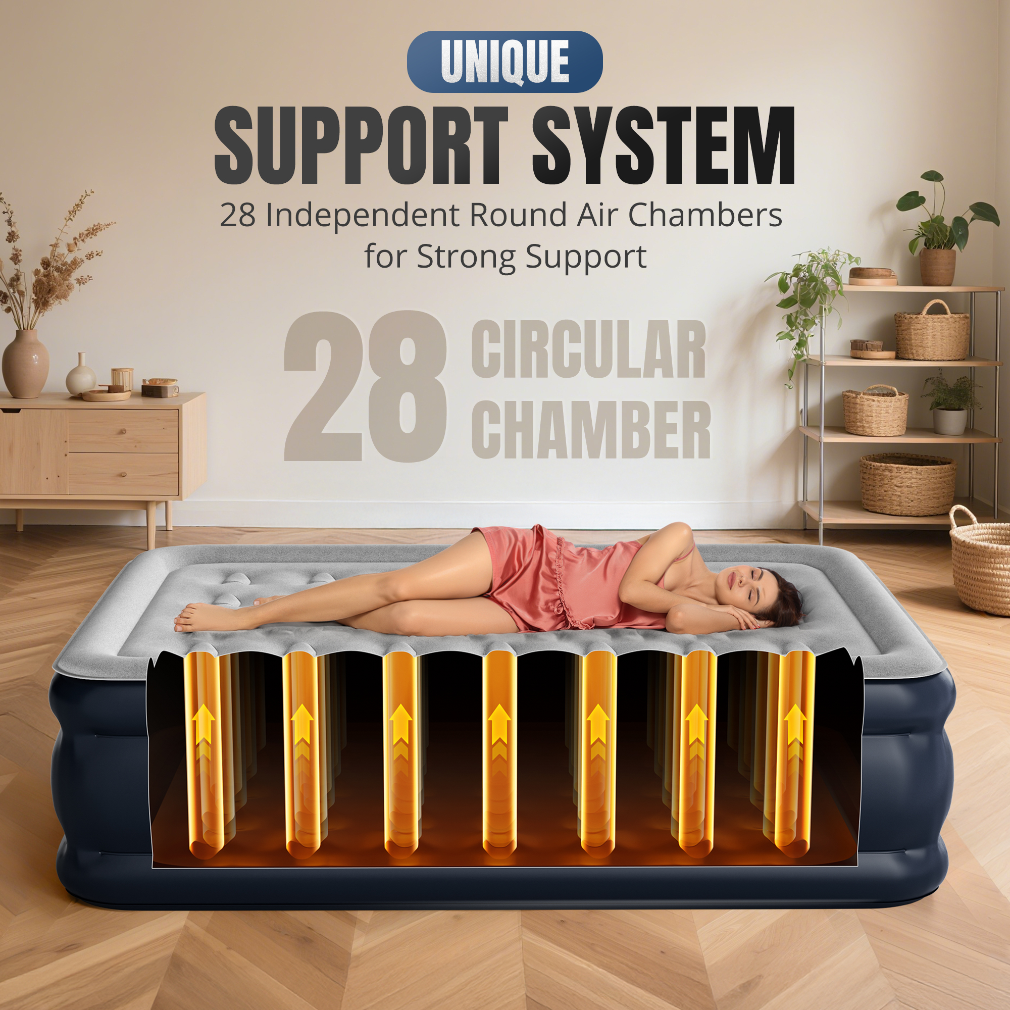 - Innovative Independent Support System: Our inflatable mattress features a unique independent support system composed of multiple air chambers. Each chamber operates independently, adapting to your body shape and movements to provide targeted support precisely where you need it most. This design not only enhances overall comfort but also helps reduce pressure points, ensuring a peaceful sleep for people of all body types.