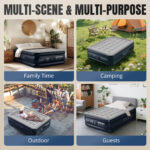 - Built-in High-Efficiency Pump – This inflatable air mattress features a powerful pump that inflates in just [3] minutes (exact time may vary). The easy-to-use control panel lets you adjust firmness instantly—no manual pumping or long waits. Deflates just as fast for compact storage.”