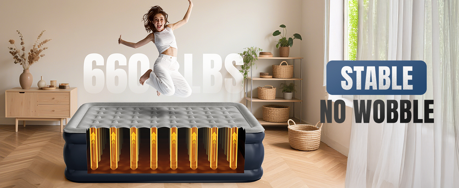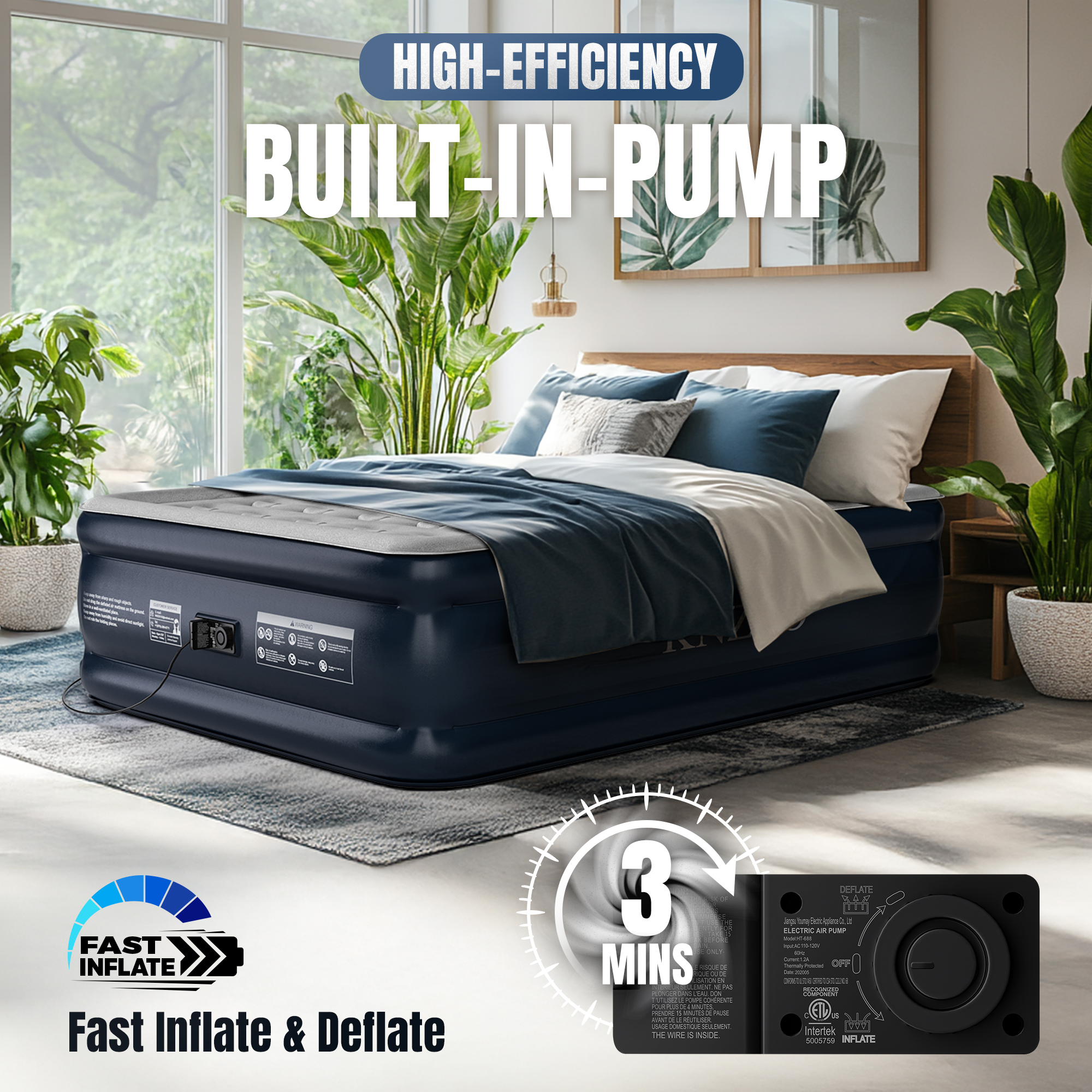 - Built-in High-Efficiency Pump – This inflatable air mattress features a powerful pump that inflates in just [3] minutes (exact time may vary). The easy-to-use control panel lets you adjust firmness instantly—no manual pumping or long waits. Deflates just as fast for compact storage."