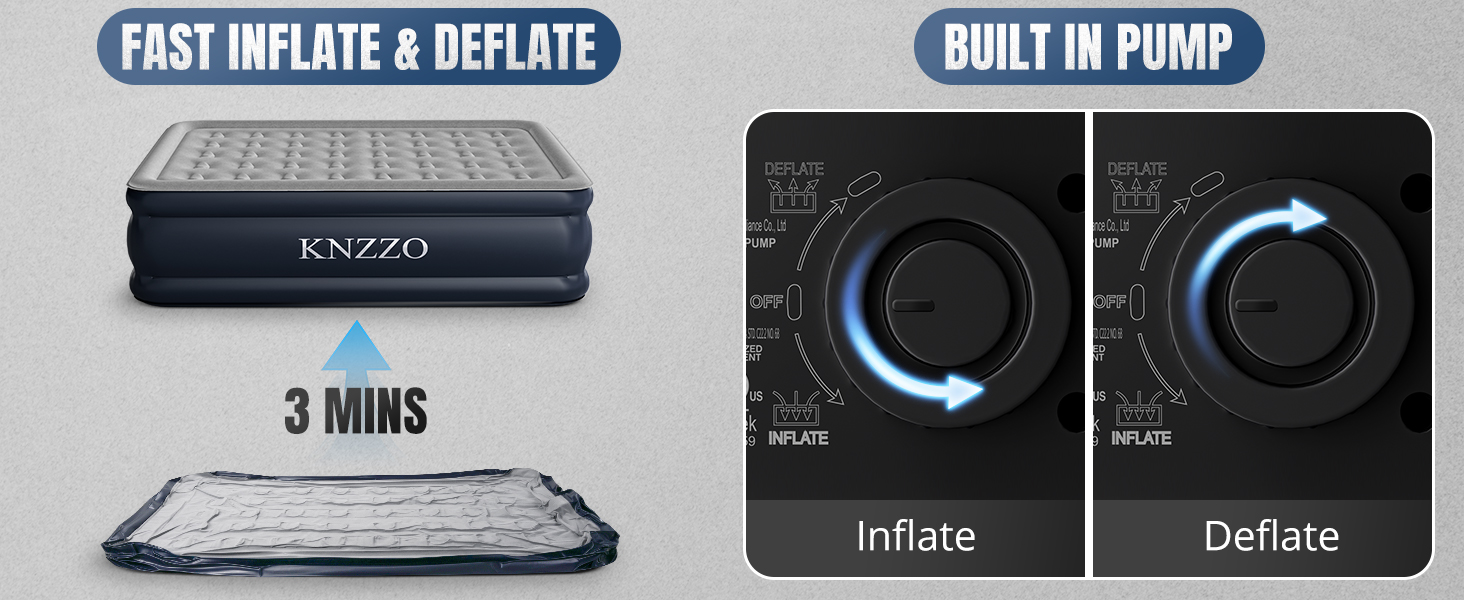- Efficient Inflation and Deflation: The air mattress with built in pump inflates or deflates the mattress quickly, transforming it into a bed in just minutes. You can easily adjust the firmness of the air bed to match your personal preference for softness or firmness