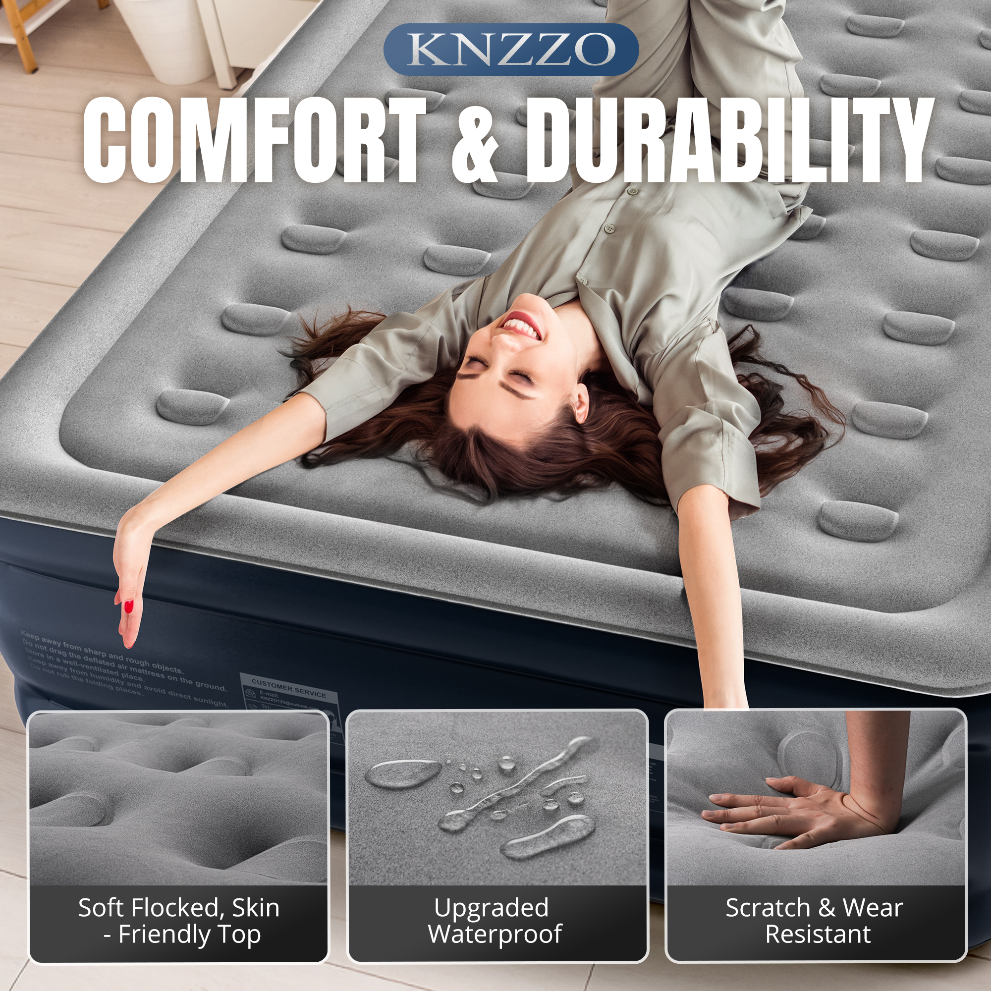 KNZZO Full Air Mattress with Built-in Pump, 18″ Top Inflatable Mattress with Waterproof Flocking Fabric, Three-Minute Quick-Inflatable Bed. Portable Blow Up Mattress for Home, Outdoor and Guests
