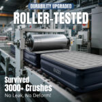 - Upgraded waterproof flocked fabric – This air mattress features a soft, skin-friendly surface with reinforced abrasion resistance. The durable treatment protects against daily wear, spills, and rough handling, making it ideal for inflatable mattresses used indoors or outdoors. No leaks, no peeling—just long-lasting comfort.